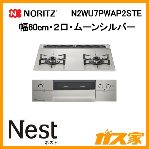 ノーリツのガラストップのガスビルトインコンロ Nest(ネスト)シリーズ2口コンロN2WU7PWAP2STEです。天板はガラストップ:ムーンシルバー。レンジフード連動タイプです。