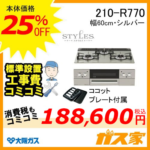 大阪ガスのガスビルトインコンロSTYLES(スタイルズ)Rシリーズ210-R770です。天板幅60cmで天板はガラストップのシルバーカラー。水無し両面焼きグリル。高火力バーナーは9段階で調節が可能(火力を制御するエコモード搭載)。付属品:ココットプレート・グリル焼網。