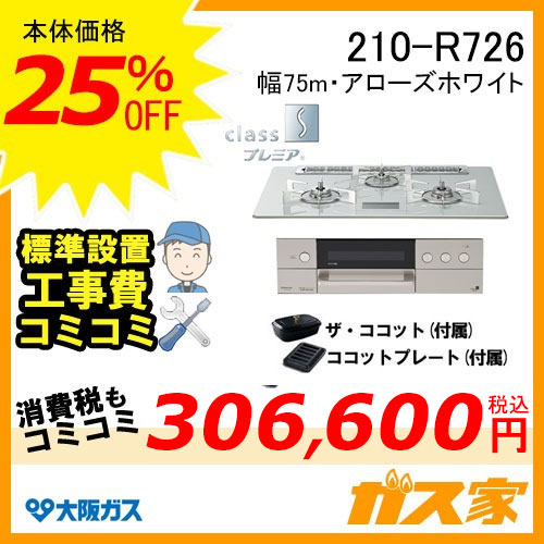 210-R726大阪ガスのガスビルトインコンロ「class Sプレミア」。210-R726は、コンロ幅75cmで天板はガラストップ:アローズホワイトです。毎日の料理がうれしくなる最高峰の一台。オートメニューが充実し、コンロでもグリルでもお手軽に本格料理を楽しむことができます。お手入れもより簡単に、焦げ付きを抑えるヒートオフ、煙やニオイを大幅にカットするスモークオフ機能などを取り揃えています。操作部液晶式、天面表示あり。
