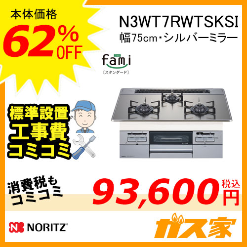 N3WT7RWTSKSIノーリツのビルトインコンロ コンロ幅75cm【標準取替交換工事費込み】セットです。N3WT7RWTSKSIは、ガラストップ:シルバーミラー。グリル機能がランクアップし、従来品から約4cm引き出し幅を伸ばした充実グリルは、焼き網の脚をなくしてシンプルなフラット形状になりました。左右どちらのバーナーも高火力からトロ火まで自由自在です。温度調節機能も左右バーナーに搭載し、揚げ物や焼き物が便利に手早く調理できます。シンプルで使いやすさが魅力のfamiスタンダードシリーズ。 fami(ファミ)・スタンダードの説明はコチラ