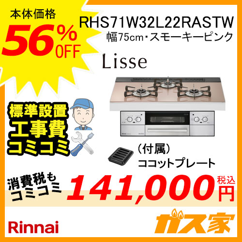RHS71W32L22RASTWは機能的で使いやすい、シンプル&スマートなビルトインコンロ。こちらはリンナイ製ビルトインコンロ【標準取替交換工事費込みセット】です。RHS71W32L22RASTWは、天板はガラストップ・スモーキーピンク。当店でシルバーに続いて人気のピンク系カラーです。LiSSe(リッセ)シリーズはドイツ製ショット社の傷がつきにくく色鮮やかなガラストッププレートを採用しています。グッドデザイン賞を受賞しました。キッチンと一体感のあるスタイリッシュ仕様のフェイスデザインや、安定感のあるごとく、すっきりとしたデザインでお手入れもラクになったキャップレスバナーなど、機能的なデザインが満載。もちろん震度4以上の地震で自動消火する揺れピタや鍋なし検知、焦げつき消火などスタンダード機能もついています。オートグリル調理機能に加え、焦げ付きにくいイージークリーン天板、煙を81%ニオイを99%カットするスモークオフ機能も搭載した充実したシリーズです。トースト・焼き魚・あたためはグリルオートメニューで調理することができ、グリルは遠赤外線セラミックバーナーでこんがりとおいしく焼き上げます。レンジフードとエコ連動機能がついており、コンロの火加減で風量を自動で切り換え、消費電力を約29%カットします。LiSSe(リッセ)シリーズにはココットプレートが付属します。