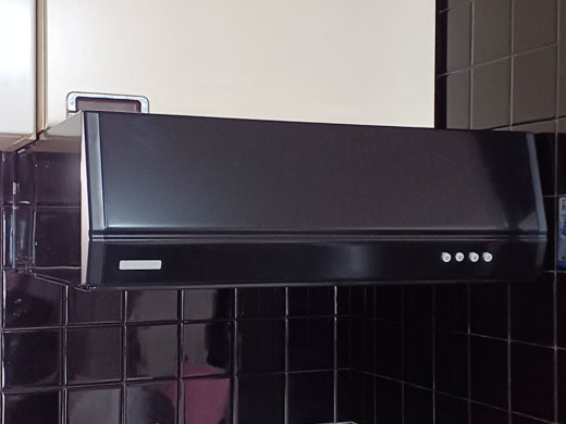 やり取りの中では、現状のレンジフードの幅や高さ、取り付け状況などを丁寧にご共有いただき、適合する機種として同等サイズの富士工業製レンジフードをご提案いたしました。ブラックカラーのシンプルなデザインで、キッチン空間にも馴染みやすいモデルです。
